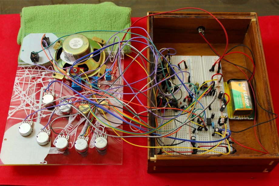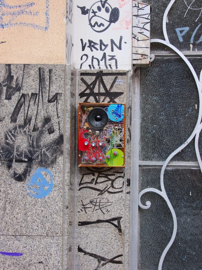 Caixa sonora de madeira e acrílico recheada de componentes eletrônicos. Apresenta em seu lado superior controles (chaves e potenciômetros) que conforme combinados geram distintos sons. No interior da caixa o circuito foi montado em uma matriz de contato. Foram utilizados diferentes circuitos integrados: 40106, 741, 4046 e 386. O sistema é alimentado com corrente contínua (bateria 9V). Para fixação o objeto dispõe em sua base tiras de velcro. O objeto foi projetado para ser facilmente fixado em diversos locais verticalizados ou inclinados, tais como paredes, portas, tapumes e colunas.