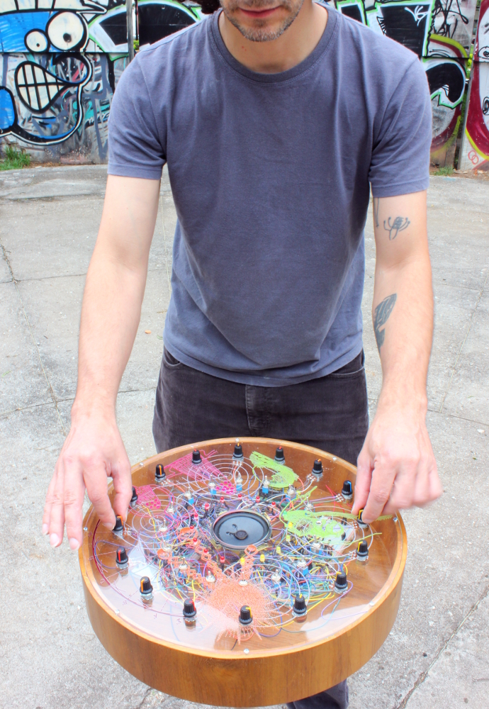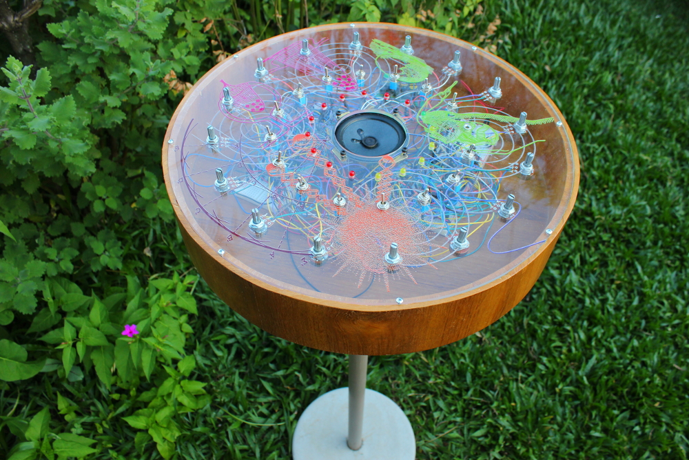 Caixa sonora de madeira e acrílico recheada de componentes eletrônicos. Apresenta em seu lado superior controles (chaves e potenciômetros) que conforme combinados geram distintos sons. No interior da caixa o circuito foi montado em matrizes de contato (protoboards). Foram utilizados diferentes circuitos integrados: 40106, 741, 4017, 4051, 4040 e 386. O sistema é alimentado com corrente contínua (bateria 9V). Para fixação o objeto dispõe de suporte em concreto e pvc. O objeto foi projetado para ser facilmente inserido em diversos locais sem a necessidade de fixação.