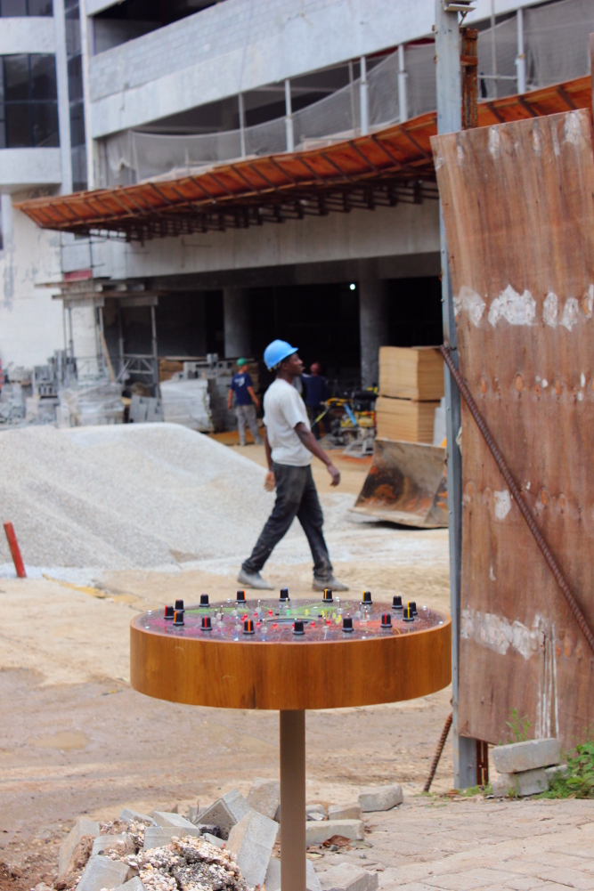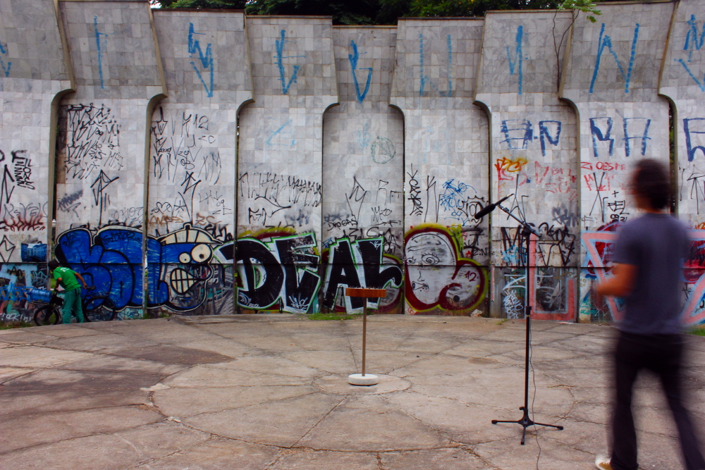 Em outra imersão, optou por registrar o objeto em uma concha acústica pública, no caso uma praça. Uma das concepções desse objeto é a possibilidade de mais de uma pessoa interagir com o instrumento ao mesmo tempo.